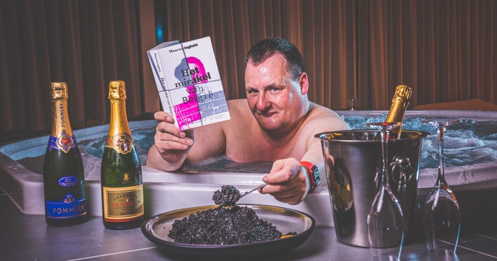 “Het klinkt een beetje conceptueel, en dat is mijn werk ook, zonder dat het gewichtig wordt, want daar heb ik dan weer een hekel aan. Ik verkies ook niet literaire onderwerpen, en vindt deze foto hier (haalt even de ingekaderde versie ervan), met meesteroplichter Piet Van Haut in een jacuzzi met champagne en kaviaar – en Het mirakel van België in de handen – zo ongeveer het hoogste wat je als schrijver kan bereiken. Die foto stond paginabreed in Het Laatste Nieuws. Geweldig toch? Een literaire glitch in het systeem.”